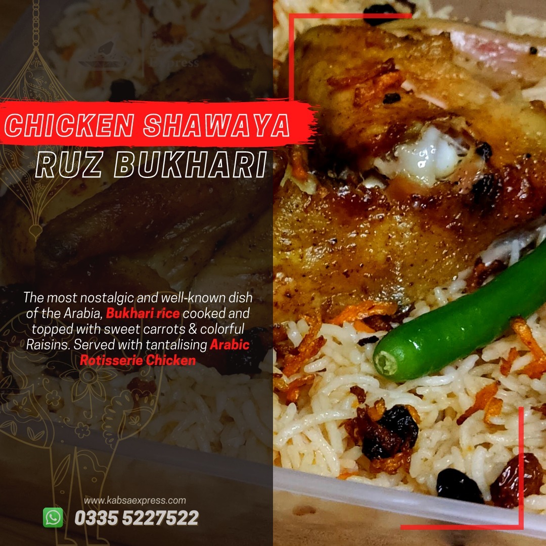 The most nostalgic and well-known dish of the Arabia, Bukhari rice cooked and topped with sweet carrots & colorful Raisins. Served with tantalizing Arabic Rotisserie Chicken.